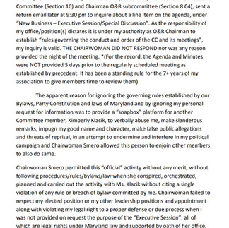 ✅4) the quorum is based on the number of currently serving, registered AND recognized on file with the Maryland Board of Elections…not just those present in the meeting or “appointed” at the last minute. So unless these rules of procedure were followed, ALL of this is improper and when it violates Bylaws, it’s also ILLEGAL under Party and State law.